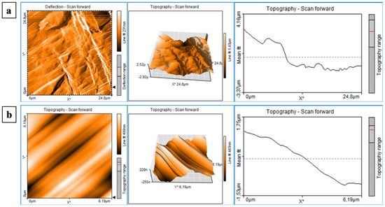 Atomic force microscopy is used in the analysis of construction materials and paints to highlight the surface profile and characterize the surface condition of these materials [19,20]. The main parameters that were monitored included the mean roughness (Ra) and the mean squared roughness (Rq) of a line on the investigated surface, as well as Sa and Sq, which represent the corresponding parameters for the entire analyzed surface [21]. The average roughness (Ra) represents the average value of the individual heights (surface asperities) and the depth of the arithmetic mean elevation of the profile. The root mean square roughness (Rq) is the square root of the sum of the squares of the individual heights and depths from the mean line of the investigated line.