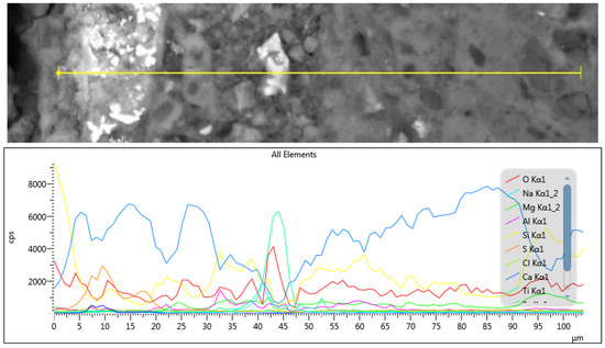 The EDX spectra allow the elemental analysis of the mortar components, which complements the XRD analysis and enables correlation between the microstructure and composition of the layers and areas that have undergone advanced degradation. The variation of the sulfur content on the thickness of the sample (Figure 8) and the EDS mapping (Figure 9) shows the presence of sulfur on the surface of the sample. The superimposed spectra drawn at different points concerning the surface (Figure 10 showed the variation of the sulfur content from the pictorial layer toward the inside.