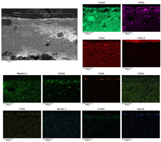 The superimposed spectra in Figure 10a show the evolution of the elemental composition on the thickness of the fresco. The red pictorial layer exhibits specific elements (spectrum 11). The intonaco layer shows an increasing content of Ca and Si, as seen in spectra 12 and 13. The support layer, depicted in spectra 14 and 15, has high levels of Si, indicating the abundance of quartz in the sedimentary rock. The elemental composition and the superimposed EDS spectra highlighted the presence of high concentrations of calcium and oxygen on the surface, which are associated with the carbonation layer formed during the drying of the fresco. Additionally, the presence of iron, sulfur, and mercury in the pictorial layer was observed (Figure 10c).