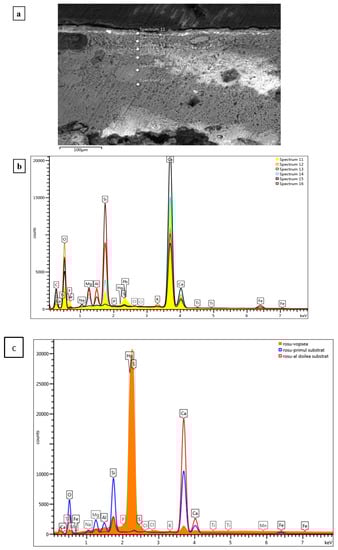 Figure 10. Superimposed EDS spectra in two areas of the section. (a) MEB image; (b) the evolution of the concentration of the elements on the thickness of the fresco fragment Figure 10a, 11-pictorial layer (with the presence of Fe-hematite, Hg, and S-cinnabar), 12-intonaco layer, 13-interface intonaco–arriccio, and 14-15-16-arriccio; (c) composition in three points (for another area in the fresco) orange for the pictorial layer (with the presence of Hg and S-cinnabar and Fe-hematite), blue for the intonaco layer, and red for the arriccio layer. For the mortar layers in both figures, the presence of specific chemical elements can be noted.