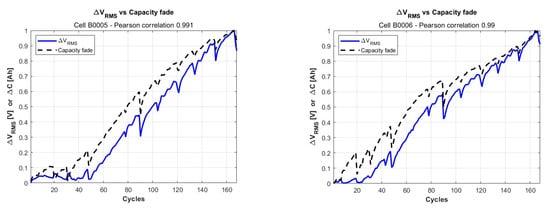 However, the behavior and accuracy of ΔVRMS in quantifying the capacity fade needs to be evaluated. The Pearson correlation R is a useful statistic for this purpose. Figure 2 compares the behavior of the two indicators ΔC and ΔVRMS for one of the cells analyzed, where a strong correlation is seen with R = 0.99. More details can be found in Section 4.