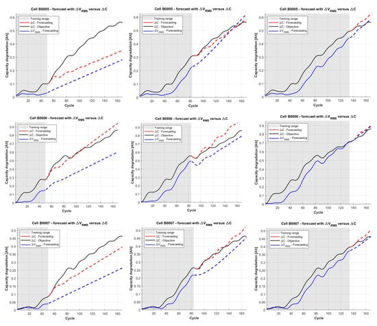 Figure 9 shows three ARIMA predictions at different cycles for each analyzed cell. The training range varies between 30% (left), 50% (middle), and 80% (right) of the cell lifetime. Each plot shows the behavior of the measured capacity fade ΔC (black line, which corresponds to the objective time series) and the forecasting results using the proposed health indicator ΔVRMS to estimate ΔC (blue line) and the forecast directly using ΔC (red line). The solid lines of ΔVRMS and ΔC refer to known values, while the dashed lines refer to predicted values.