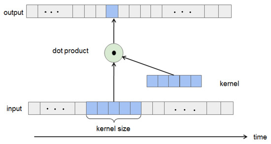CNN is a successful deep learning framework first proposed by LeCun et al. [15]. In the study of deep learning, in 1D-CNN (also known as time-domain convolution), the convolution kernel is a vector with a length of N, which is used for neighborhood filtering of one-dimensional input signals and extracting local features. The kernel slides along a one-dimensional time axis. It is often used to process NLP and time series data. It is shown in Figure 3.