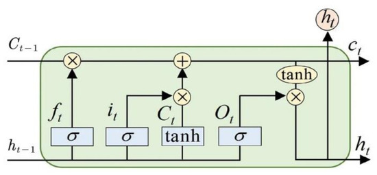 A long short-term memory network (LSTM) is an improved cyclic neural network used to solve the problem that RNN networks cannot deal with long-distance dependence. Hochreiter proposed the LSTM algorithm [16], which can store data information in a longer time step. Regarding the problem of time series prediction and analysis, LSTM can predict future data characteristics through the data characteristics of the past period time. LSTM networks enable nodes to “remember” or “forget” data through a “gate” structure, which mainly includes three “gates”: the forgetting gate, the information adding a gate, and the information output gate. Through these three “gates”, the input of each cell state contains the output of the previous moment, and the input of the current moment also contains some information stored by the node itself. Therefore, LSTM has a better performance on longer sequences. It is shown in Figure 4.
