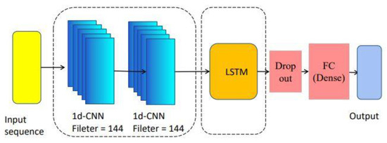 Proposed CNN-LSTM model architecture with input sequence, two CNNs layer, an LSTM layer, a dropout layer, dense layer, and an output.