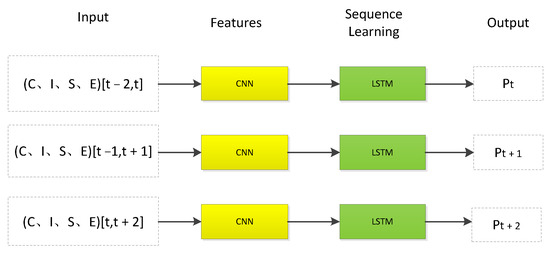 CNN-LSTM model operation diagram, the yellow parts represent the layer of CNN, and the green parts represent the layer of LSTM.