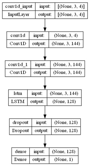 In the CNN network, we set the data input feature to 4. We conducted performance tests using input time sliding of 3, 5, or 10. Taking into account performance factors, the best performance was found for a time sliding of 3. The time sliding window was set at 3, the stride was set at 1, the kernel size was set at 1, and the activation function used RELU. The activation function of the LSTM layer was RELU. We used a grid search for hyperparameter optimization. We tested the performance of the SGD, Adagrad, and Adam optimizers [17] in this application. Finally, the optimizer selected Adam, the loss function selected MSE, and the drop layer was set to 0.35. The following network architecture design was sampled. It is shown in Figure 7 and Table 1.