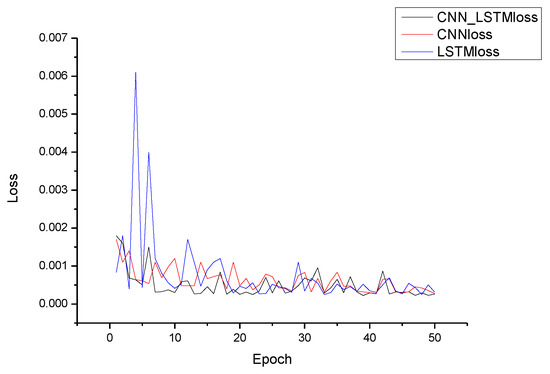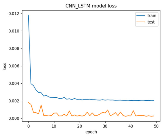 We set epoch = 50 and batch_Size = 70. The change in the loss value with EPOCH is shown in Figure 11. The training set fluctuated in the early stage. With the increase in EPOCH, the loss value gradually converged. The predicted value and actual value are shown in Figure 12 below. It can be seen that the data prediction at some inflection points had more errors. It also can be seen that when using the CNN-LSTM model, the loss function of the training set converged better (see Figure 11 and Figure 12).