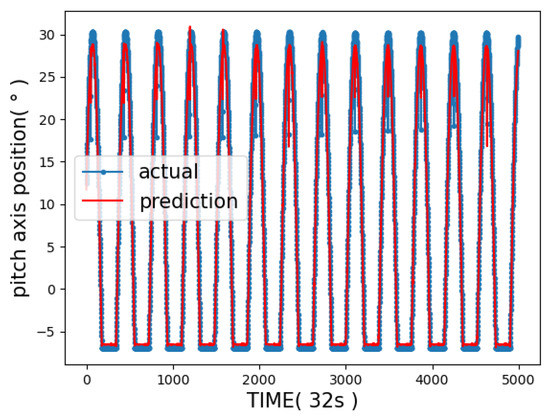 Compared with the trajectory prediction method mentioned above, the pitch axis trajectory prediction of a two-dimensional turntable is a typical time series prediction problem [18,19]. It is not only related to the previous running state of the turntable but also is affected by the running state of a period of the time window. From this point of view, HMM and an extended Kalman filter only predict the next state through the last state, and the results will affect the accuracy of the prediction [20]. We did not use the equation of motion either, thereby avoiding uncertainty error analysis. We used a deep learning model to predict the trajectory by extracting and learning data features. We used a sliding time window instead of just the last state, and our findings were in accordance with recent studies indicating that a prediction model based on deep learning can achieve satisfactory results [21,22,23,24,25,26]. The prediction model based on the LSTM model could effectively avoid gradient disappearance or gradient explosion. In the process of debugging parameters, we also found that the initial value of parameters affected the final performance of the model. The size of the dataset also limited our choice of models. This model had a better performance on a small data set. For the comparison of the performance indicators of the LSTM model and CNN model alone, we could see that the sun vector combined with CNN-LSTM model had a better performance.
