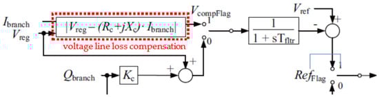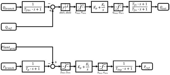 The REPC module is known as the generic renewable plant control model, and the model consists of two parts: an active power control loop and reactive power control loop, as shown in Figure 2. All parameters and their meanings in the REPC module are listed in Table 1. According to the power electronic control circuit design, the active power loop and reactive power loop can be controlled independently before the capacity exceeds the rated apparent power [,]. The functions can be changed by switching flags including frequency control, voltage control, and reactive power control functions.
