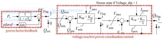 The power factor feedback and voltage reactive power coordination control block diagrams of the REEC.