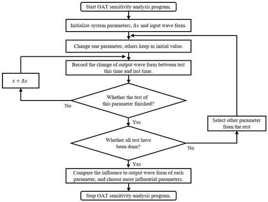 This study used a common key parameter analysis method, OAT, which changes only one system parameter at a time under the same input condition, and judges the influence of the parameter by observing the system output response variation. The method is easy to implement, but when the parameters are correlated with each other, this dependence cannot be described. The OAT flowchart is shown in Figure 10.