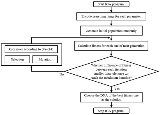 According to [,], IGA is provided with the idea of the survival of the fittest, and the offspring generated by the crossover operation is adjusted based on traditional GA. The exchange of parent genes is changed to the method of Equations (9)–(14). According to the arrangement of fitness, the first individuals with better fitness are maintained as the offspring generated by the crossover operation. This change increases the diversity of the offspring, and the benefit of a global search can be increased.