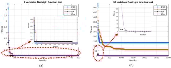 When the Rastrigin function with two variables was used for verification, the four algorithms could achieve a global optimal solution, as shown in Figure 15a. The initial values of the four algorithms were random, but could converge at the global optimal solution eventually. When employing the Rastrigin function with a two variable optimization solving problem for testing, the PSO could converge at a global optimal solution rapidly, and there were merely eight iterations. This means that the method had excellent performance in the case of low problem complexity and a small number of solved variables. The IGA needed 17 iterations to solve optimization problems and was a little slower than PSO, but it could reach a global optimal solution with a small number of iterations. The IPSO algorithm converged at a global optimal solution after 45 iterations. As the algorithm aims to maintain the diversity of variables when the IPSO search exceeds the boundary, and it is likely to fall into the local optimal solution, the IPSO loses convergence speed but enhances the capability of the global search in comparison to PSO. When the problem complexity and the number of variables increased, the algorithm still had a better performance than PSO. The algorithm that converged last was GA, which needed about 181 iterations before converging at a global optimal solution.