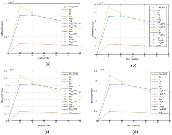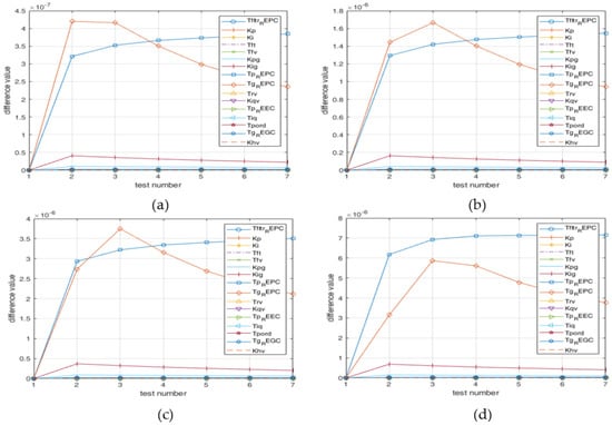 The initial values of the universal model parameters of the WECC energy storage system selected in this study were adjusted based on the manufacturer’s preset parameters. There were two classes of target parameters of the key parameter analysis: the initial value of one class was not 0, and the initial value of the other class was 0. The variation in the former in each test was increased by 5%, and there were six variations. With the addition of the original initial value, there were a total of seven simulations. The adjustment range of the latter one in each experiment was increased by 0.01, which is a large variation range in the search area of the time constant and controller coefficient of the system model. Afterward, the influence of the system parameters listed in the key parameter analysis in the cases of active power step input and reactive power step input was demonstrated. Figure 16 shows the differences among the parameters in the pooled variance of system output response in the current experiment and previous experiment when the active power step was imported. Figure 17 shows the differences among the parameters in the pooled variance of system output response in the current experiment and previous experiment when the reactive power step was imported. The first experiment was given with zero as it was free of a previous experiment, and it was not taken into consideration. The variation in the difference of the square of the subsequent output response was observed as the basis of the key parameter screening.