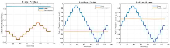 The measurement waveform of the applicability evaluation also included constant active power input and reactive power step output, and active power step output and reactive power fixed input, as shown in Figure 19.