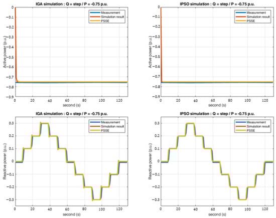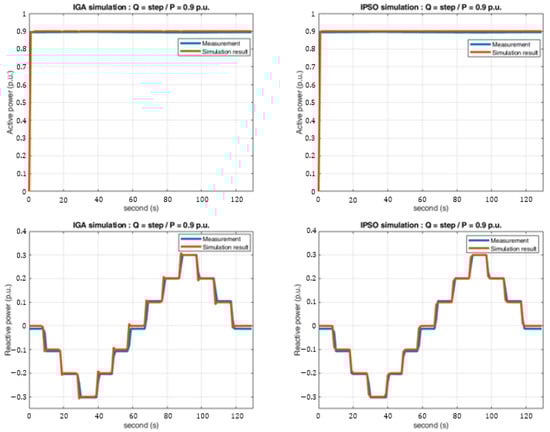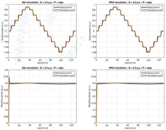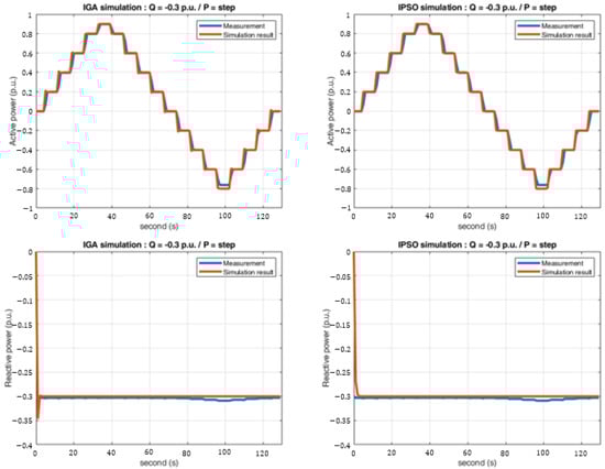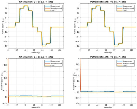 The energy storage system parameters selected by the key parameter analysis in the previous section were used as the variables searched when the optimization algorithm solves problems. The IGA and IPSO had the same range of variables searched and the interval. The searched population quantity and number of iterations were set as the same numbers to guarantee the rationality of fitness comparison between the two algorithms. The initial global optimal solution used the same values, and the two algorithms had the same fitness baseline. There were two kinds of measured waveforms of the actual energy storage system output response: one was used to optimize the algorithm variable search, and the other was used to evaluate the global optimal solution parameter applicability. The input waveform used when the algorithm searched for the optimum parameters included three classes of step response: constant active power output and reactive power step output; active power step output and constant reactive power output; active power step output and constant reactive power input, as shown in Figure 18.