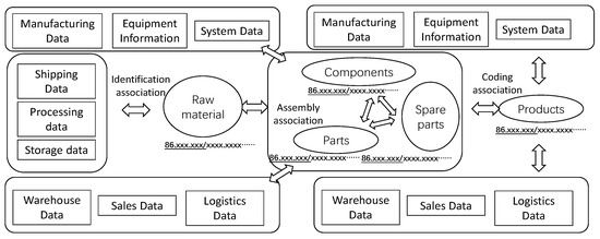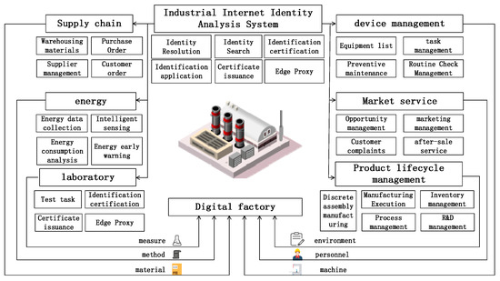 The industrial Internet identity resolution technology is one of the key technologies to perform data sharing between the upstream and downstream of the industrial chain [36] and the information systems within the enterprise. The full connection digital factory focuses on the production, processing, transportation, product testing, and other links. The scanning of the product identification code, automatic acquisition of raw materials, parts, and products, finished product process parameters, and other information allows to achieve more efficient, flexible, intelligent, and accurate parameter configuration. It is also efficient for equipment control, process association, problem analysis, and other applications. In network collaboration, information correlation is established through the identity resolution in production processing, supply chain, and other links. Thus, the enterprises can share production capacity, inventory, logistics capacity, and other information in real time, so as to perform the design, (external) production, online sharing of manufacturing capacity, and accurate management of supply chain. The servitization extension focuses on the production, logistics, maintenance, and other links. By scanning the product identification code, the relevant information of raw materials, parts, and products can be automatically obtained from upstream and downstream enterprises. Using data governance, the identification application of product traceability, predictive maintenance, and spare parts management can be realized. In digital management, due to the complexity of the product circulation links, it focuses on exploring the product code allocation and identity resolution [37] to open up the data links of different upstream and downstream enterprises in product circulation, perform the data linking covering production and manufacturing, as well as the whole-life cycle management and supply chain, improve the decision-making efficiency, and allow more accurate and transparent management. The application of full connection digital factories with identity resolution is shown in Figure 4.