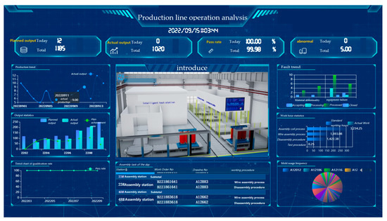 In terms of intelligent operation and maintenance of workshop equipment, various production data of workshop production equipment are collected, processed by edge computing analysis and manufacturing operation management platform, and displayed on the production line screen of the digital intelligent control center. Workshop production managers follow up on the data on the screen and resolve the unexpected production anomalies. Through 3D modeling, the 3D model corresponds to the workshop entity one by one. According to the equipment operation instructions, the maintenance time of each part can be marked on the 3D model. When the maintenance period is approaching, it will be reminded on the screen to assign code binding to each part. Scanning the corresponding two-dimensional code before the operation and maintenance of the workshop equipment parts allows to record their specific situation. The data will be synchronized on the screen of the production line. In addition, the operation and maintenance personnel of the production equipment and the implementation of the operation and maintenance technology of the workshop will be traced. The production situation of the workshop and the situation of each equipment will be displayed on the screen of the production line. The main page of the visual equipment management platform has modules such as the production line introduction, planned output, production trend, qualified rate of production line, abnormal safety light, and on-hours statistics, as shown in Figure 8.