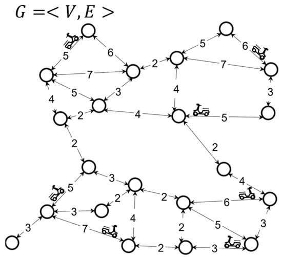 Road Network. In this paper, we abstractly modeled the real road network as a directed weight graph, , each road was regarded as an edge of , and the road endpoints were regarded as the corresponding vertices of , where is the set of nodes on the road and is the set of edges on the road. A vertex on the road is , is the abscissa of the vertex, is the ordinate of the vertex; an edge on the road is , is the road. The starting point of is the end point of the road, and is the length of the road. The road network used to illustrate the concepts in this paper is shown in Figure 2.