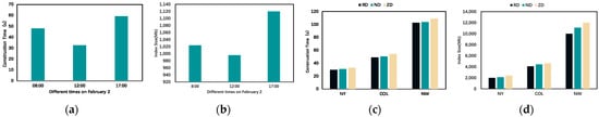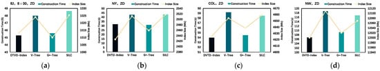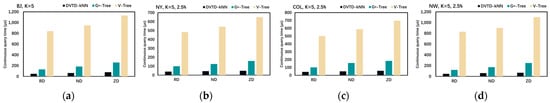Among them, the construction time of the DVTG-Index was composed of the network construction time, vertex distance matrix calculation time, and vertex elevated graph construction time; construction space was composed of the road network set, boundary vertices and active vertex sets, vertex distance matrix, and vertex elevated graph. As shown in Figure 8a,b, 8:00 and 17:00 in Beijing are the morning and evening peak periods, respectively; therefore, there are more moving objects and increased time and space factors for the index construction. As shown in Figure 8c,d, the number of vertices and edges of the road network sets NY, COL, and NW increases sequentially. The constructed DVTG-Index needs to construct more vertex subgraphs and calculate more vertex distance matrices at the same time, so that the memory space occupied by the index increases sequentially and the construction overhead time also increases. In addition, different distribution strategies of moving objects also have a certain impact on time and space costs. Under the three distribution strategies of RD, ND, and ZD, the time and space costs of the constructed DVTG-Index increase in turn. With an uneven distribution, the indexed grid requires more merge-up and split-down operations, thus requiring more time and space overhead.