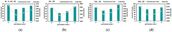 When the index is constructed, the number of grid divisions determines the number of grids in the initial index. According to the above factors, if the grid is divided times, the number of grids is . The number of grids determines the size of the grid area and determines how many nodes and moving objects are included in the grid; therefore, we changed the number of grid divisions to evaluate the time and space overhead of the DVTG-Index on each dataset. To exclude the influence of other factors, in this experiment, we adopted the ZD distribution strategy, and the data shown in the chart are the average of the results of multiple experiments.