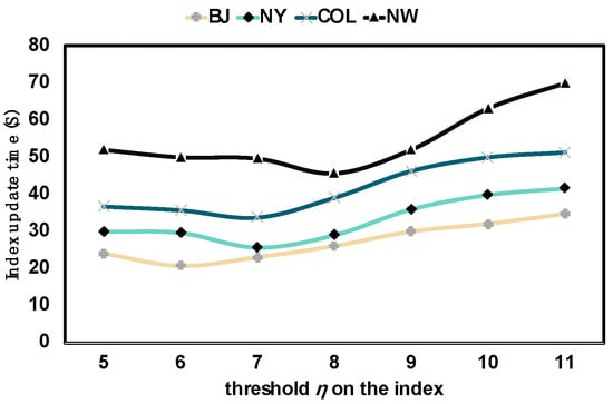 As shown in Figure 12, it can be seen from the experimental results that there is no positive or negative correlation between the index update time cost and index grid threshold . When the threshold is relatively small, as the moving objects change, the index grid is more likely to be split down or merged up until the number of moving objects in the grid meets the threshold range, which takes a long time to update the index. As the threshold gradually increases, the number of moving objects that can be accommodated in the grid increases, and the time for grid scaling decreases so the total updated overhead time decreases. However, when the threshold gradually increases to a certain value, the number of active vertices in a single index grid is also very high, which makes the calculation time of the vertex distance matrix in the grid increase sharply. This makes the total time cost of the index update gradually increase with the increase in the threshold. In addition, the results of different datasets show that there are corresponding optimal thresholds in different road networks to minimize the update time cost, and the optimal value of the threshold increases with the increase in the dataset.