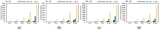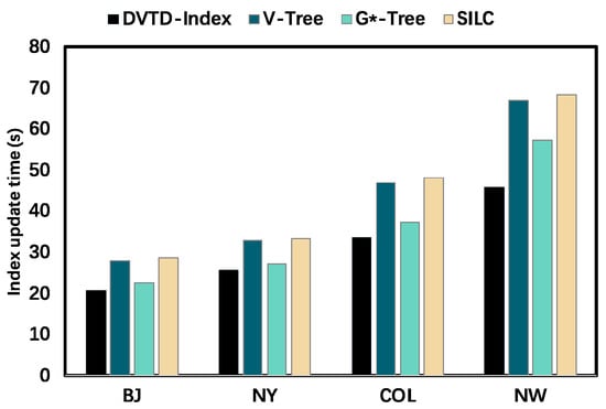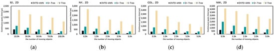 Finally, we conducted comparative experiments on the index update performance of V-Tree, G*-Tree, SILC, and the DVTG-Index. Dataset BJ takes 100% of taxis as moving objects, 5% of the number of generated vertices in datasets NY, COL, and NW as moving objects, and ZD as the moving-object distribution strategy.