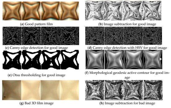 However, there are not many studies yet that have been used to classify 3D film images as good images and bad images, and there is a limit to solving the classification problem with the methods described above. This is because image subtraction only is insufficient for obtaining high accuracy; binarization should find the optimal threshold value. In addition, even though binarization thresholding methods are simple and easy to implement, binarization thresholding methods can be sensitive to noise, as the threshold value is often determined based on the intensity values of the pixels in the image. This can lead to the misclassification of pixels, resulting in an inaccurate representation of the image. Edge detection can provide information on the boundaries and shapes of objects within an image, which can be useful in tasks such as object recognition, tracking, and segmentation. In addition, edge detection algorithms are relatively fast and can be applied to large datasets. However, they can be sensitive to noise and may produce false positives or false negatives in noisy or low-contrast images. Moreover, the choice of algorithm and parameters can greatly affect the accuracy and quality of edge detection results and may require manual tuning. SVM has high accuracy in image classification tasks, particularly with complex datasets. However, SVM is not very fast and requires finding optimal hyper-parameters to determine the penalty for the error. On the other hand, the morphological geodesic active contour method can accurately segment complex objects with irregular shapes and boundaries. However, the algorithm can be computationally expensive, especially for large images or datasets. Moreover, it may not work well for images with overlapping objects or highly connected structures. Additionally, it is difficult to solve the classification problem using template matching because the 3D film image in this paper is not printed in the same texture and size. Furthermore, it is not easy to detect good and bad 3D film images in this paper because the contrasts of pixels in the image are different from one another.