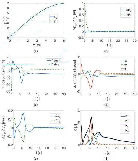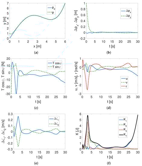 Simulation results for sine trajectory: (a) desired () and realized (p) trajectory; (b) position errors (in inertial frame); (c) input signals components (applied force) ; (d) actual velocities ; (e) changes in quasi-velocity (); (f) changes in kinetic energy () during motion.