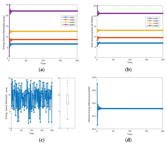 Analysis of queue stability (a) energy queue of node k (b) data queue of node k (c) energy queue of HAP (d) network average energy efficiency queue.