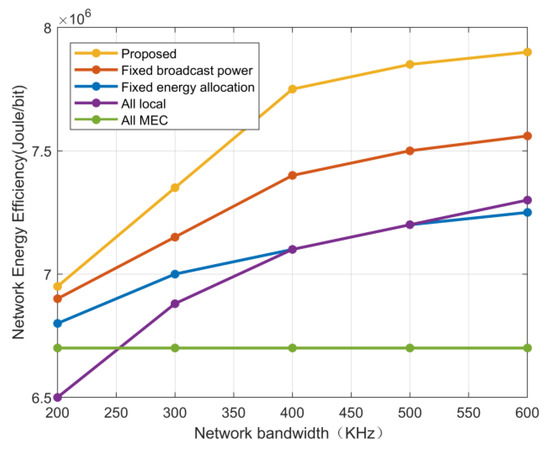 Figure 4 analyses the effect of the total network bandwidth on the network energy efficiency for different algorithms. Clearly, the network energy efficiency increases as the total bandwidth increases. This is because a larger bandwidth means lower energy consumption required for offloading tasks, which enhances the network energy efficiency. The comparative analysis in Figure 4 shows that the larger the part of the network that is used for remote offloading decisions, the more the average network energy efficiency increases with bandwidth, but as the bandwidth continues to increase, the network energy efficiency tends to stabilize, which is because network energy becomes critical to limiting network performance in the latter stages.