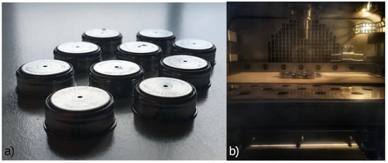 iButtons DS1923: (a) detail of the ten iButtons DS1923; (b) the ten iButtons DS1923 as installed in the climatic chamber.