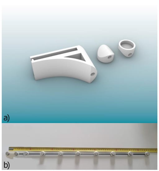 The hardware elements of the system were created with a 3D printer according to the DIY philosophy. A clip and 10 housings for the ten iButtons DS1923 sensors were designed and 3D printed (Figure 2a). The 3D-printed parts and the ten DS1923 sensors whose performance was checked in the climatic chamber were arranged along a carbon rod of 5.5 mm in diameter and 64 cm long (Figure 2b) and placed equidistant 8 cm from each other, except for the first segment on the left in Figure 2b, where a double resolution was considered, with an additional sensor placed 4 cm from the left end to account for different boundary situations (greater proximity to the human body).