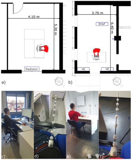 Autumn and summer setup: (a) office plant used for the autumn scenario; (b) ZEBlab room used for simulating the summer scenario (HE = Heat Exchanger; EHwF = Electric Heater with Fan; with blue dot, the position of Pt100 connected to the thermoregulator used to control the EHwF); (c) picture of the autumn scenario with user and hardware in the considered environment; (d) detail of the hardware as mounted in the autumn scenario; (e) picture of the summer scenario with user and hardware in the considered environment; (f) detail of the hardware as mounted in the summer scenario.