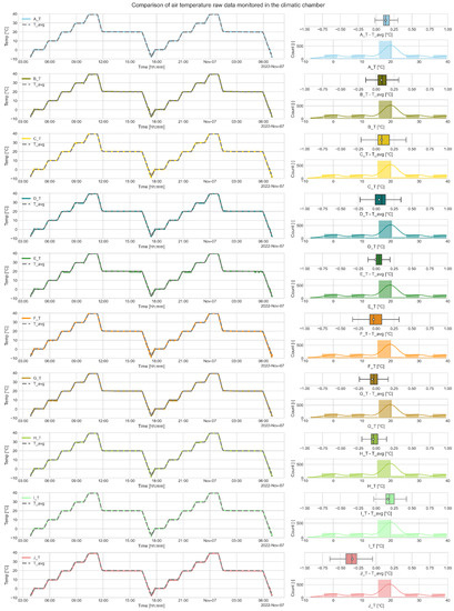The following are the results of the first test carried out in the climatic chamber to evaluate the behavior of the sensors and the correct difference in relation to T monitoring. Figure 4 shows the lineplot of the T values of the i-th sensor compared with the average trend. The histplot as well as the boxplot of the absolute difference between the value measured by each of the ten sensors and the average reference value are located on the right-hand side.