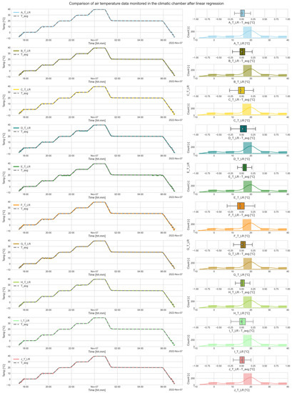 T data after linear regression (LR)—comparison in the climatic chamber: on the left, the lineplot of the i-th sensor when compared with the average values; on the right, the histplot and the boxplot of the absolute difference between values recorded by each sensor and the average values (the white dot indicates the mean value and the black line indicates the median).