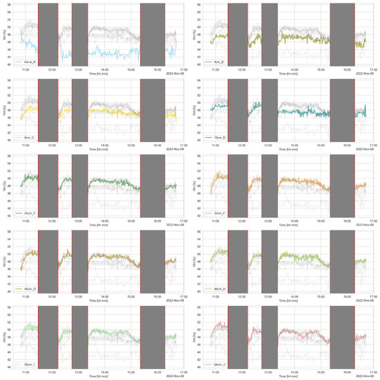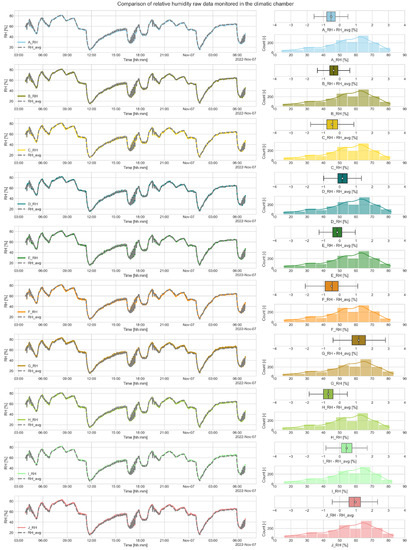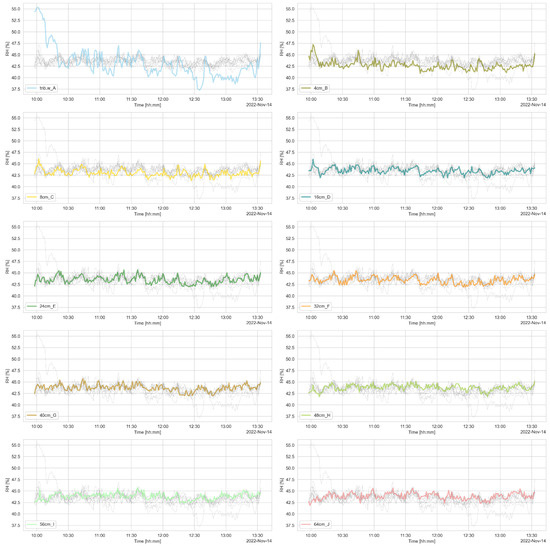 The same identical approach was used to check the behavior of the sensors and correct the difference in terms of RH monitoring. Figure 6 shows the lineplot of the RH values of the i-th sensor compared with the average trend.