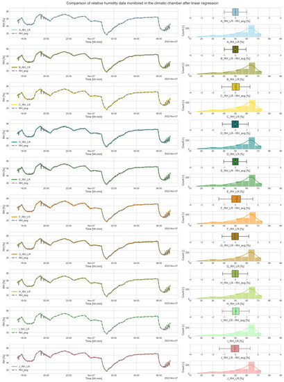 Figure 7 shows the results in relation to the remaining 50% of RH data linearized and confirms the possibility of using these 10 sensors in the further course of the experiment without considering a discrepancy in the measurements of RH due to the possible intrinsic error of the instruments used.
