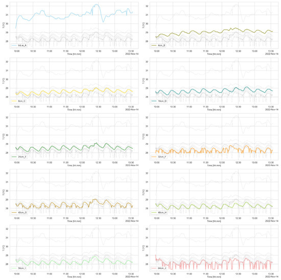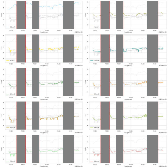 Looking at the values monitored by the ten sensors, the results show that the monitored T are almost constant, with the deviations on average tall limited to a range between −0.5 °C and 0.5 °C, although the extreme values can diverge by more than 0.5 °C, as in the case of the J_T sensor.