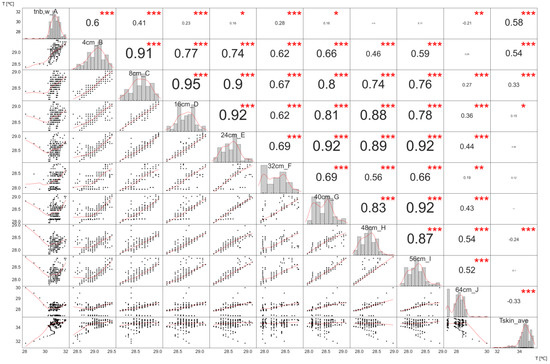 At the bottom of the diagonal, except for the first row and the last column, it can be observed that the r coefficient is at least 0.86 or higher, showing a strong [58] correlation between the different positions of the air temperature measurement in line with the physical nature of thermal conduction and convection. In fact, the bivariate scatter plots at the bottom of the diagonal, except for the first column and the last row, show a linear correlation for all measurements while the comparison of the Tskin values with the measurements of all other sensors in the form of bivariate scatter plots (last row) or r and p values (last column) shows a moderate positive correlation with the air temperature measured at tnb,w_A, which already becomes poor at 4 cm. This shows how, in accordance with the concept of HTP, the Tskin could have an influence on the thin layer of air near the human body, while it cannot influence the other layers at a great distance, as evidenced by the very low r coefficient. The statistical significance of the results is guaranteed by the very low p-values.
