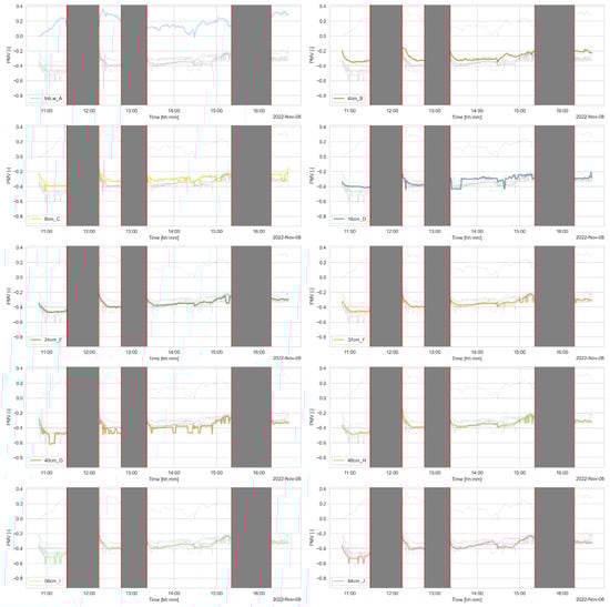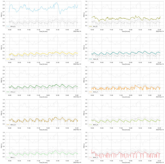 Considering the trend of the temperature and humidity curves and the data set, as described in the materials and method section, it is then possible to derive the PMV trends at different distances in autumn (Figure 14) and in summer (Figure 15). In both scenarios, the PMV index calculated with the data at tnb,w_A is higher than the others calculated at the greatest distance of approximately 0.4. In terms of the PMV, the average difference is not so pronounced with data at 4 cm if compared with other curves for the greatest distances.