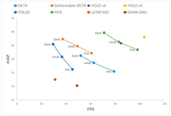 We evaluated the effectiveness of the combination attention module and the hierarchical feature fusion module. We also compared the performance of HFD with other models, such as DETR [], Deformable DETR [], LSTM-SSD [], SAAN-GRU [], YOLO v4 [], YOLO v5 [], and YOLOS [], as shown in Figure 1.
