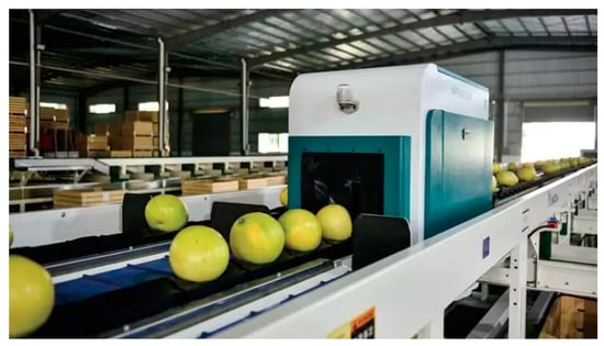 As shown in Figure 2, the pomelo images used in this work were collected from a micro-diameter high-performance pomelo sorting machine developed by the Institute of Microelectronics of Chinese Academy of Sciences and Jiangxi Reemoon Sorting Equipment Co., Ltd., (Jiangxi, China). The machine vision part consists chiefly of high-resolution industrial cameras, LED warm light sources for providing sufficient light to the camera, a photoelectric switch which is used to control image capture, and conveyor belts with rollers.