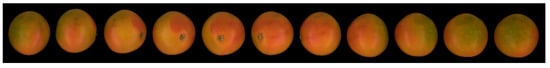 The pomelo triggers the photoelectric switch to capture images by the cameras which have 1280 × 1024 resolution and a rate of up to 60 frames per second. When the cameras capture images, the pomelo rotates with the roller to obtain the information of the whole surface of one pomelo. As shown in Figure 3, the pomelo region is extracted after applying preprocessing methods to every image.
