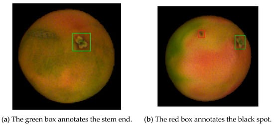 For the detection of the stem end of pomelo, there are no standard or even clear detection and grading guidelines. Researchers usually determine the detectors by experience. The deep learning method is good at extracting the hidden information from labeled image datasets [].