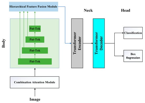 The original ViT [] is a model for image classification that uses a transformer-like architecture on various parts of the image. An image is processed as a series of small patches by transformers, making it easy to consider the interaction between patches at all positions, such as global attention. ViT [] contains three main components: patch embedding, feature extraction from stacked transformer encoders, and classification head. However, due to the high computational complexity (increasing in a quadratic way with the image size), the original ViT cannot be easily applied to a wide range of visual tasks. By introducing the concept of a shifted window that supports patch reduction and local attention operations, the Swin-Transformer [] mitigates the complexity problem and improves the adaptability to intensive prediction tasks (such as object detection). Pooling-based vision transformer [] is able to reduce the ViT structure size and improve the spatial interaction ratio of ViT by controlling the self-attentive layer. A few methods use vision transformers as detector backbones. However, they achieve limited success [,,].