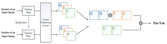Figure 6 represents the detailed structure of CAM, which has a novel attention module. We apply the efficient schemes in the Swin Transformer only to [Pat-Tok] × [Pat-Tok] attention based on the decomposition, which is the largest part of computational complexity. This adjustment totally reuses all the parameters of the Swin Transformer though the projection layers.