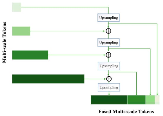 Specifically, all the multi-scale [Pat-Tok]s from the different stages are amassed to form feature maps at different scales with the same size (256) of channel dimension. They are mixed in a top-down manner. As illustrated in Figure 7, each operator receives two input feature maps for hierarchical feature fusion. The feature map in lower resolution is resized by the upsampling operator. Then, HFFM fuses the low-resolution feature map with the high-resolution one by bilinear interpolation. Hence, HFD can obtain fused multi-scale features, flattened with the spatial dimension, and chained for all scales as input to the encoder in the neck component of HFD.