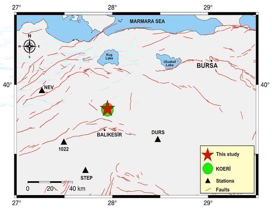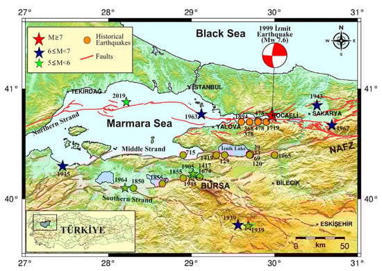 Türkiye is located in the seismically highly active Alpine-Himalayan tectonic belt. One of the most seismically active fault zones in Türkiye is the North Anatolian Fault Zone (NAFZ). It often produces destructive and damaging earthquakes. Bursa province, along with its surrounding areas, is located in this active zone and has been exposed to numerous destructive earthquakes [,,,,,]. The study area is at high risk of earthquakes. The earthquake occurred on 28 February 1855, (I0 = IX and Ms = 7.1) caused heavy damage, loss of life, and property in Bursa and its surroundings during the pre-instrumental period (<1900) [,,]. During the instrumental period (>1900), important earthquakes that occurred in Bursa and its surroundings include the 15 April 1905 earthquake (Ms = 5.6), 3 August 1939 earthquake (Ms = 5.5), 15 September 1939 earthquake (Ms = 5.8), 13 November 1948 earthquake (Ms = 5.6), and 6 October 1964 earthquake (Ms = 6.8) [] (Figure 1). The İzmit earthquake occurred on 17 August 1999 (Mw = 7.6) and caused severe loss of life and property and was also strongly felt in Bursa []. After the İzmit earthquake, some geo-scientists suggested that the next major earthquake would be on active faults located at the southwest end of the 1999 earthquake rupture [,,,]. Bulut et al. [] reported that based on slip-deficit and historical observations, three segments in the Marmara Sea could produce major earthquakes (M > 7).